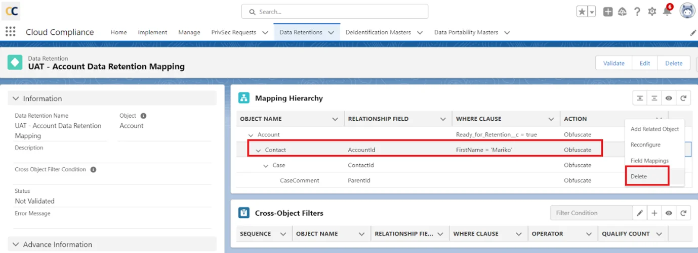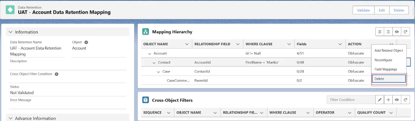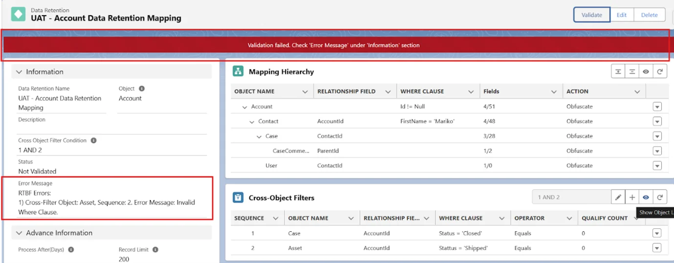 - Once a user clicks on the Validate button, CC will validate the mapping hierarchy, where clause and Cross Object Filters.
