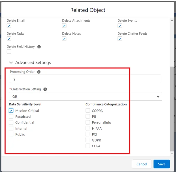 - Classification Settings: The user can De-identify the Object records as per the Data Classification and Data Sensitivity Level.