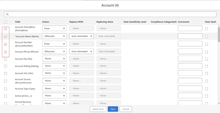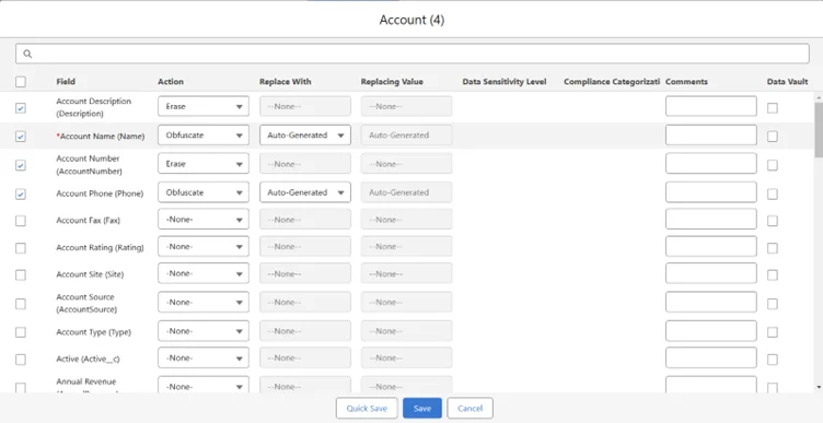 Field Mappings: The user can add field mapping for an object. After Clicking on Field Mappings, the user will see all the updatable fields for the De-identification pro