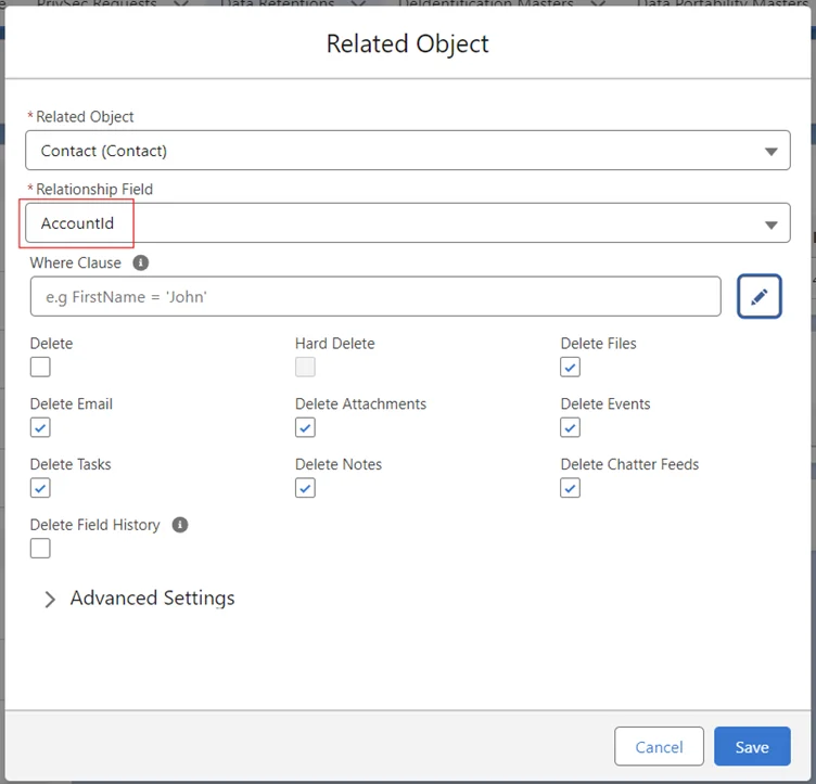 Where Clause – The “Where Clause” field allows you to filter records for De-identification dynamically and on the basis of cross-object values.