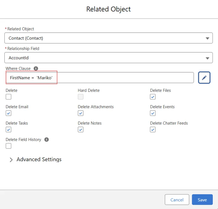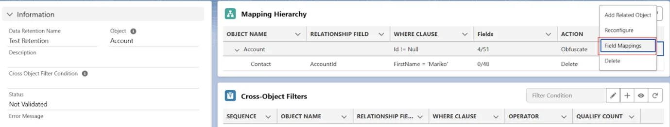 Where Clause – Filter records by entering a WHERE clause, and the filter field should be like FirstName = ‘Mariko’; hence, Retention will be performed only on those records where FirstName = ‘Mariko’ as shown in the screenshot below.