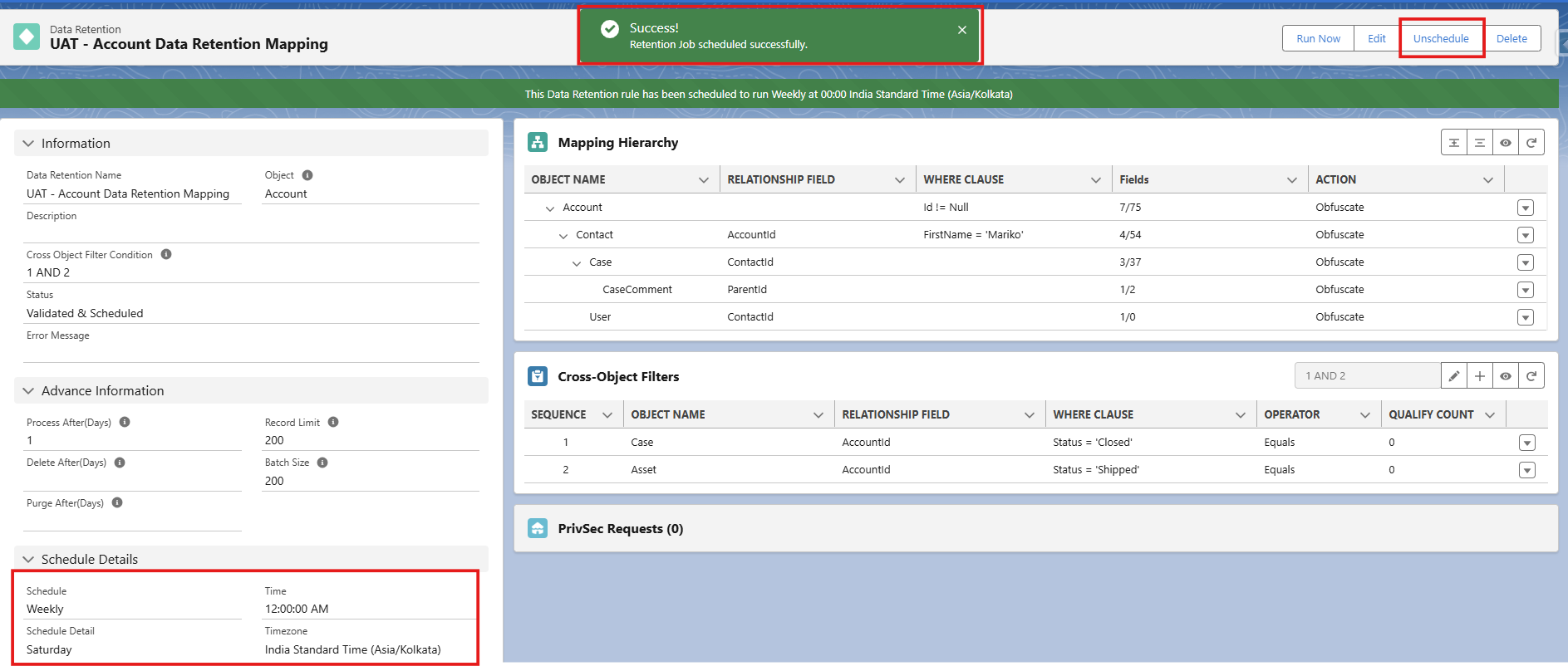- Whenever the retention is scheduled, only the unschedule button is visible and viceversa.