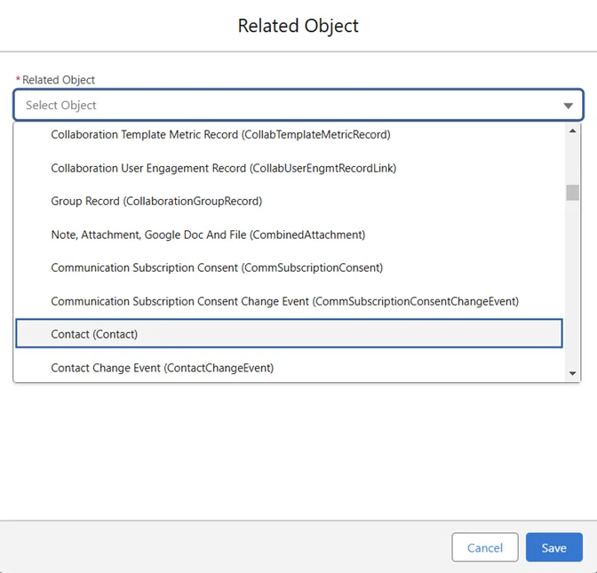 - After selecting the child object,, the relationship field between the parent and child object will be populated automatically.