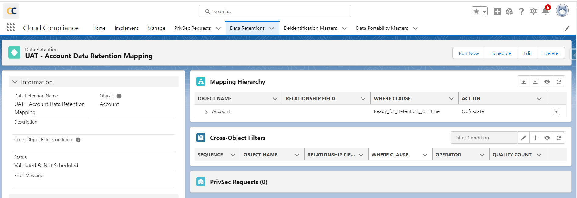 Note: Whenever Process after/Delete After or Purge After field values are in the future (i.e., Not equal to 0), then the PrivSec Retention class needs to be scheduled.