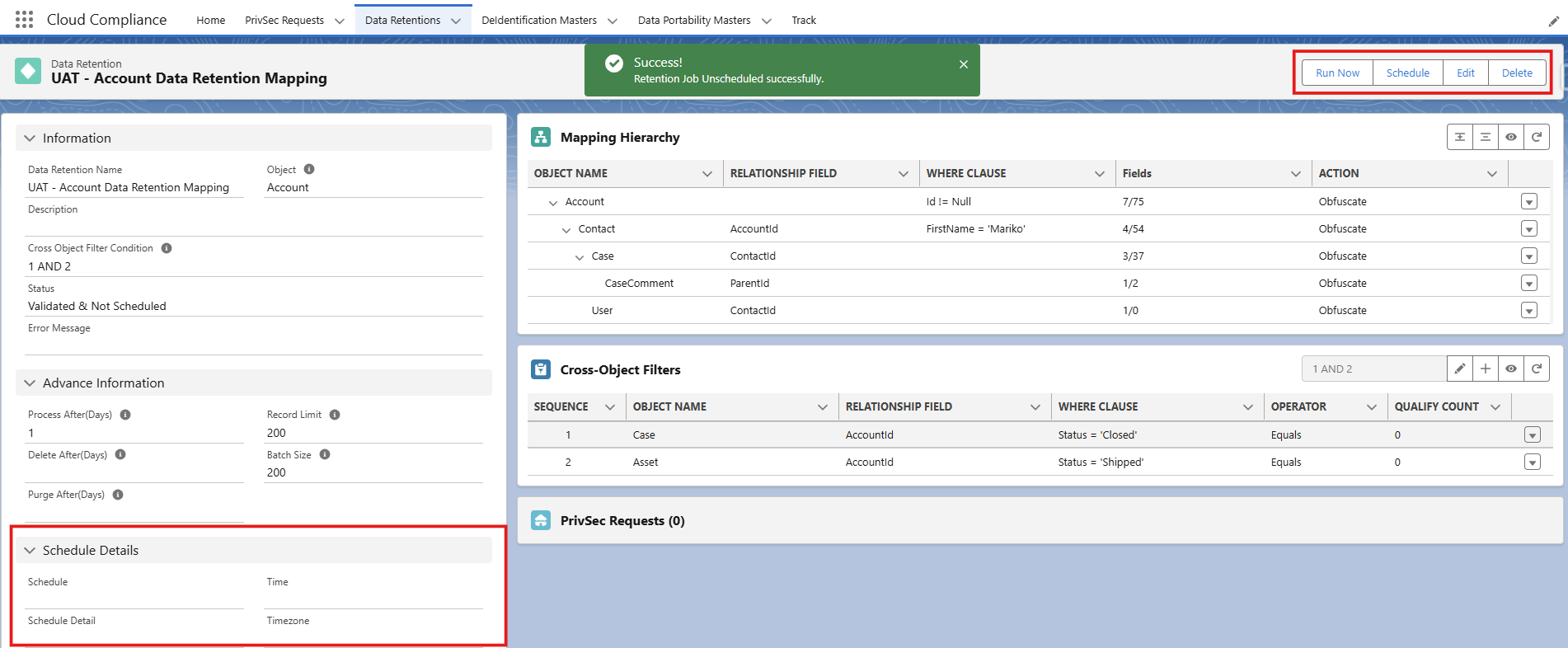 - Users can click on the ‘Unschedule’ button. This action will unschedule the retention mapping and wipe out details under the ‘Schedule Details’ section.