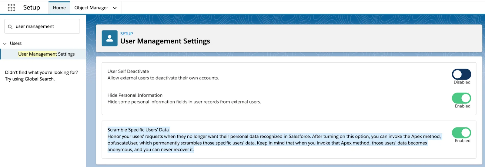 - Navigate to Setup Users User Management Settings and enable “Scramble Specific Users’ Data”.