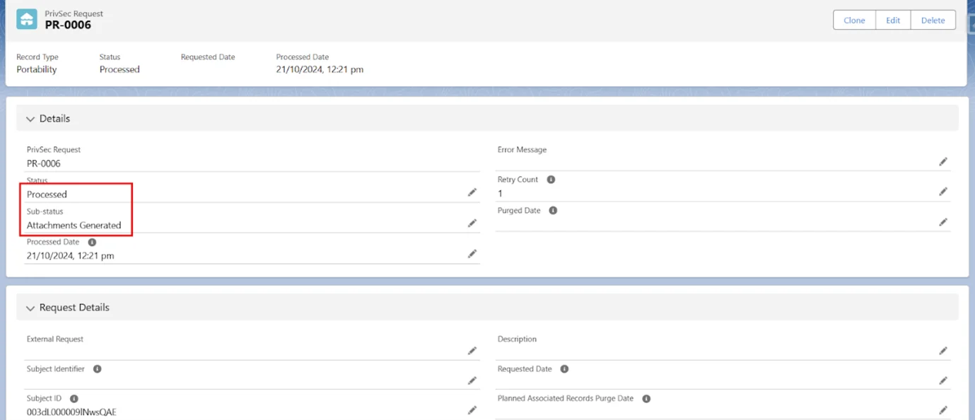 - requestId – A record id of PrivSec Request for which the user wants to get all details about Data Portability.