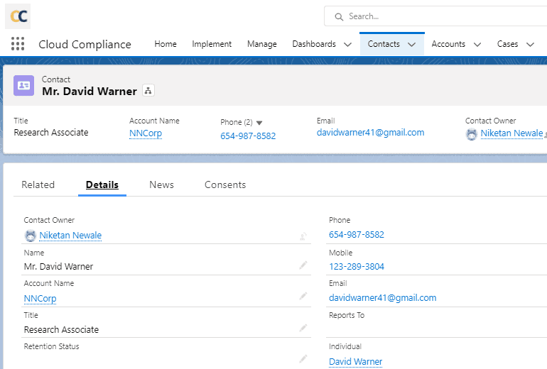 - Navigate to a Salesforce record (Contact record in this example) on which the user wants to perform Data Portability.